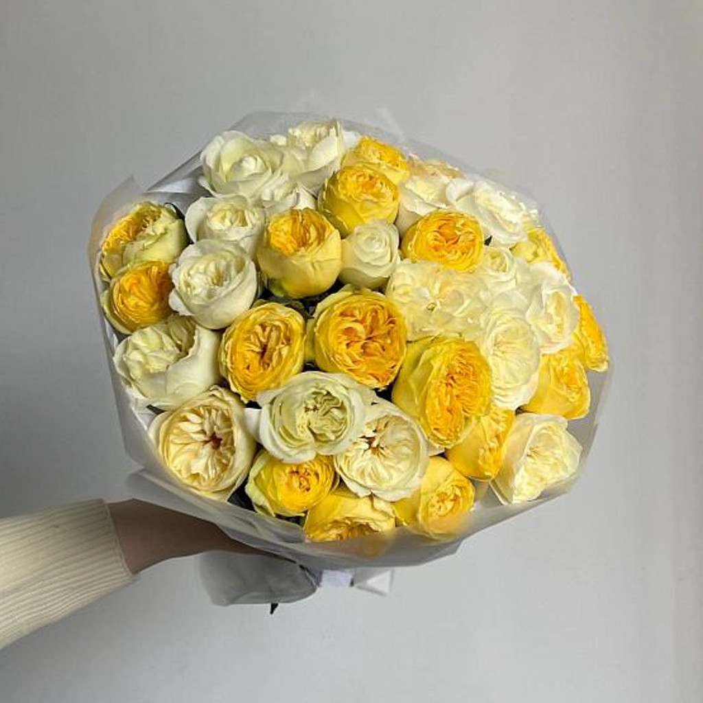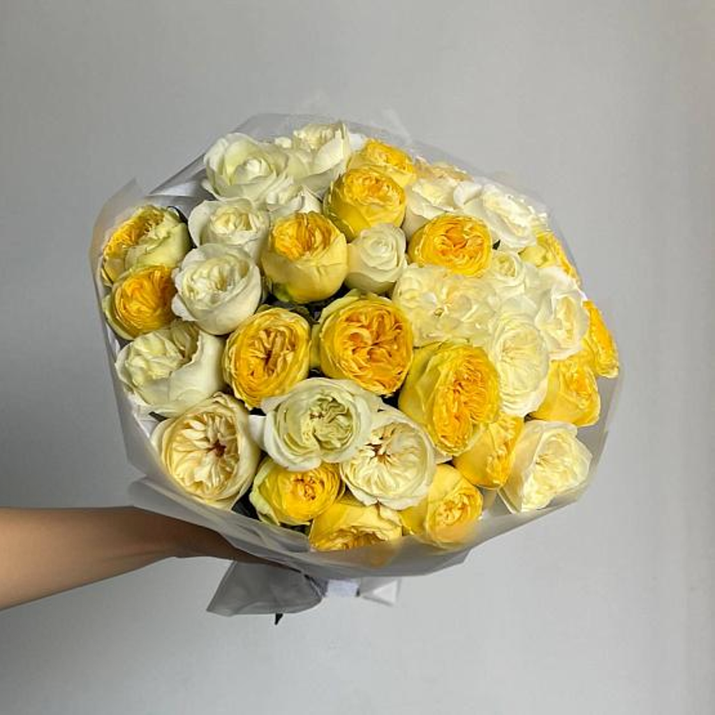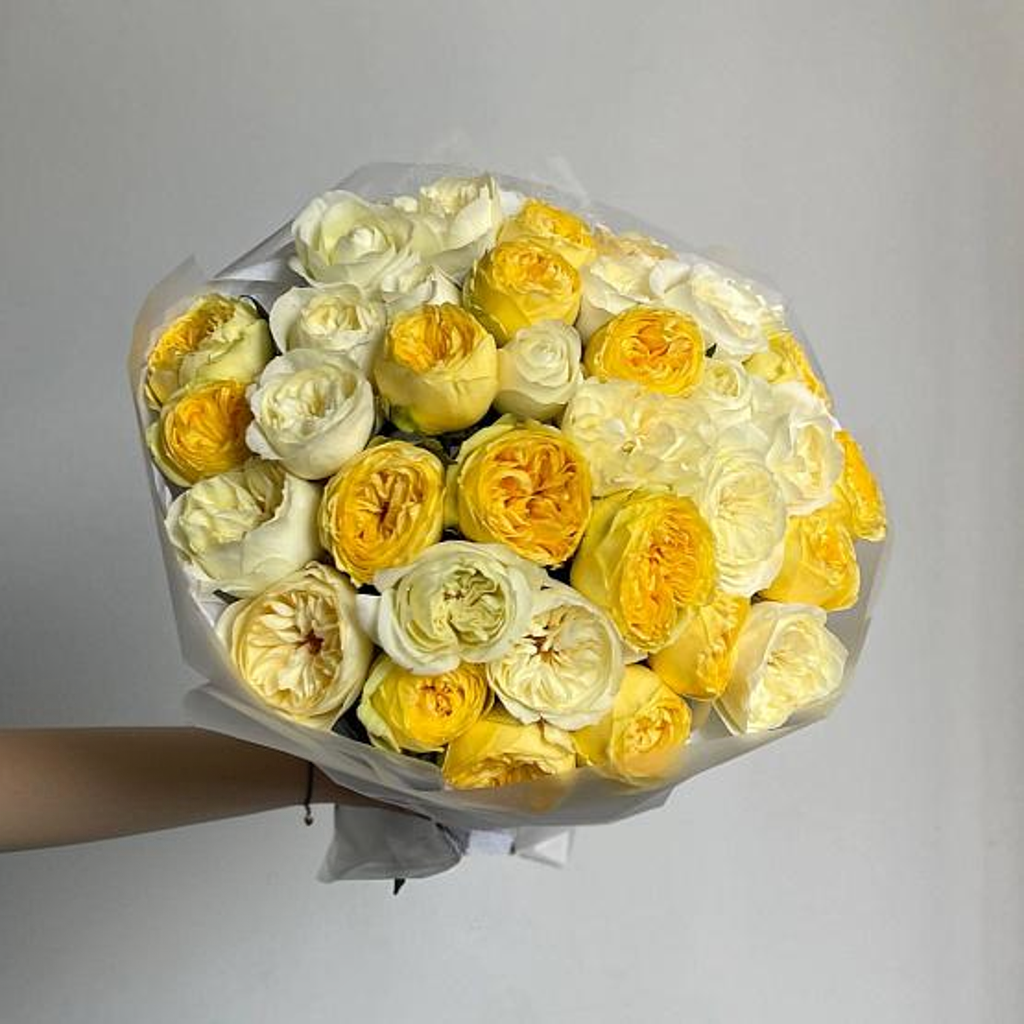 This bouquet is a stunning blend of sunshine-yellow and creamy-white premium garden roses, radiating elegance and cheerfulness. The roses are meticulously arranged to create a harmonious balance of colors, symbolizing joy, purity, and positivity. Wrapped in soft, translucent paper, the bouquet has a modern and sophisticated look, making it perfect for special occasions, from celebrations to heartfelt gestures.